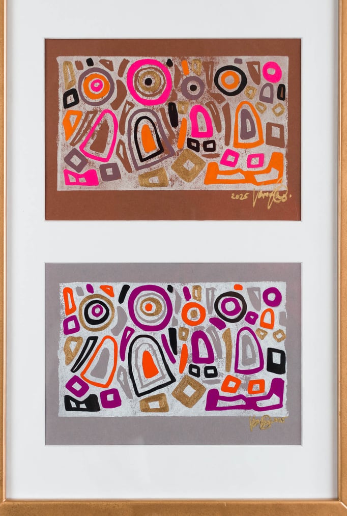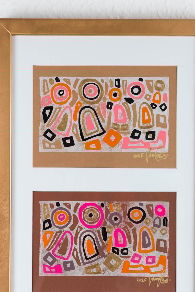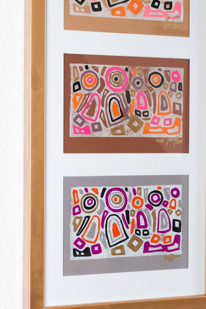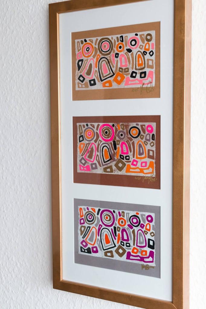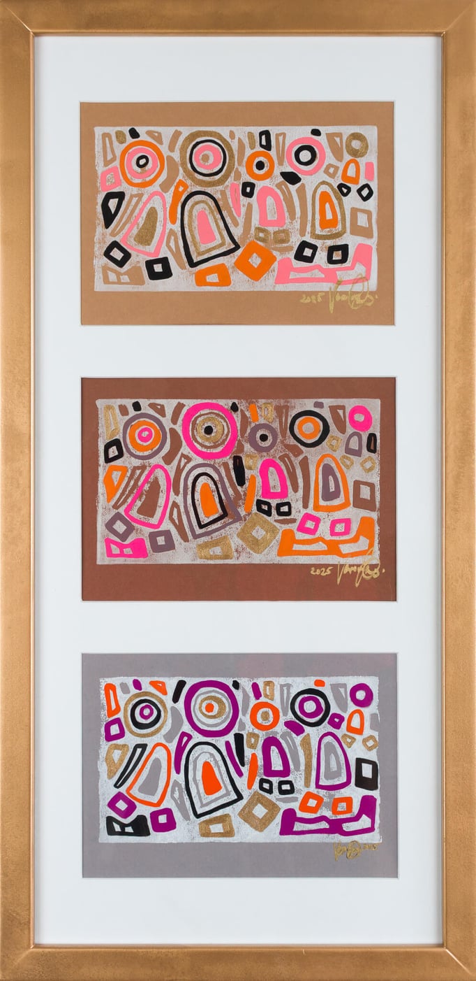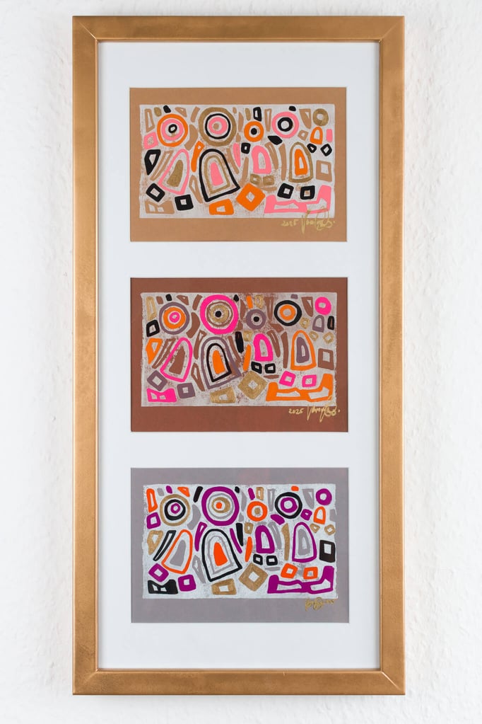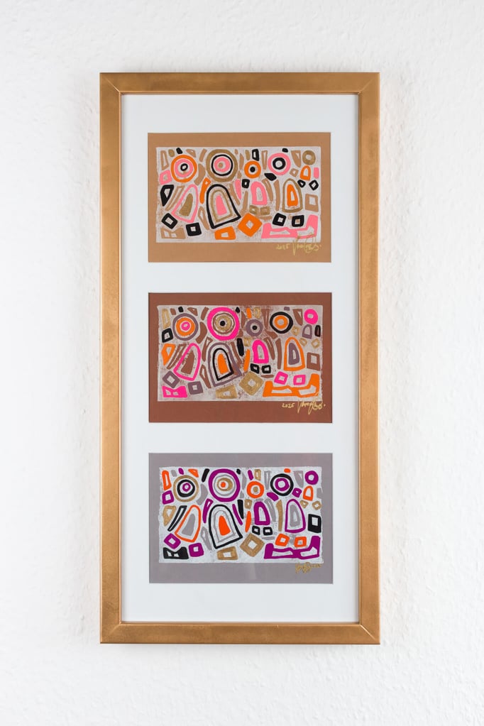 „Drei in Stimmung“ zeigt drei farblich unterschiedliche Interpretationen desselben Linolschnitt-Motivs – drei Versionen einer heiteren Szene, in der mehrere Figuren gemeinsam in einem lebendigen Umfeld stehen. Die Formen wirken wie in Bewegung, als würden sie miteinander lachen, sich austauschen oder einfach einen unbeschwerten Moment teilen.