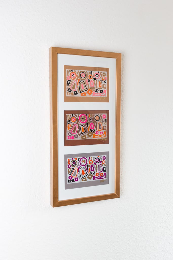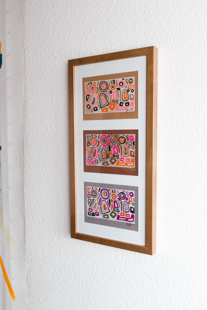 Obwohl die Figuren in allen drei Blättern gleich positioniert sind, verändert sich durch die Farben ihre Ausstrahlung – mal leicht, mal kraftvoll, mal verspielt. „In Stimmung“ lebt genau von diesem Wechselspiel: derselbe Moment, aber verschiedene Launen, die im Alltag genauso wechselnd und facettenreich erlebt werden.