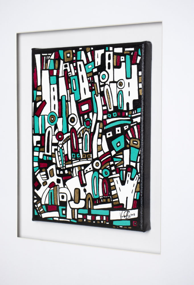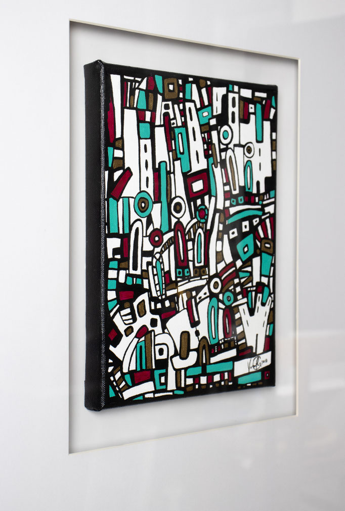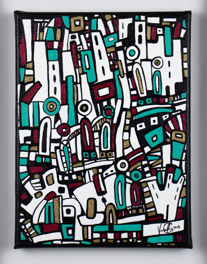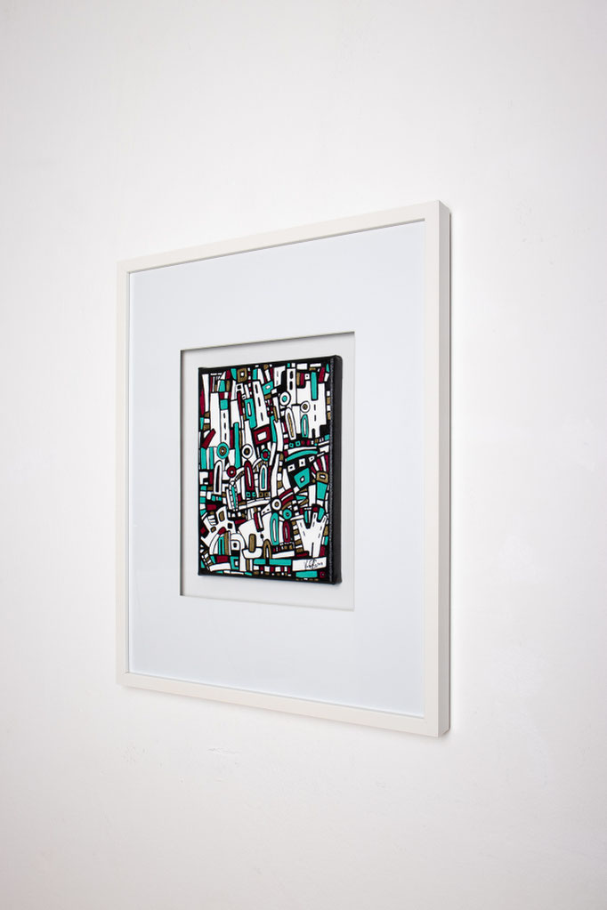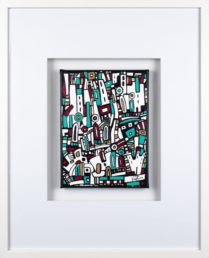 „Begegnungen“ erzählt von den Momenten, in denen Wege sich kreuzen – flüchtig, unerwartet oder richtungsweisend. Die Komposition aus geometrischen Fragmenten, lebendigen Linien und rhythmisch gesetzten Farbflächen wirkt wie ein dichtes Geflecht aus Bewegungen, Stimmen und Eindrücken. Zwischen Türkis, Gold, Weiß und tiefem Rot entsteht ein vibrierendes Miteinander: Formen stoßen aneinander, öffnen sich, verschieben sich, verflechten sich. Nichts steht isoliert – jede Linie reagiert auf eine andere, jede Fläche findet ihr Echo irgendwo im Bild. „Begegnungen“ spiegelt die Dynamik urbaner Räume wider, ohne sie konkret abzubilden. Es zeigt einen Ort, der überall sein könnte – dort, wo Menschen zusammentreffen, sich verlieren, wiederfinden und Spuren hinterlassen. Das Werk ist in Acryl auf Leinwand gearbeitet und sowohl mit als auch ohne Rahmen hinter Glas erhältlich.