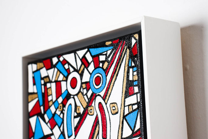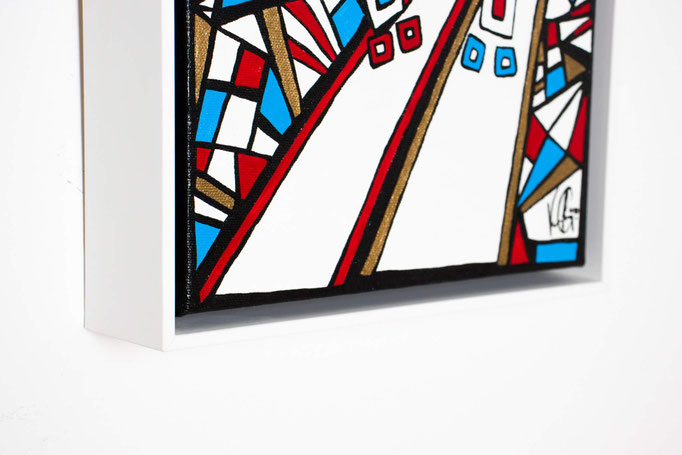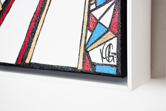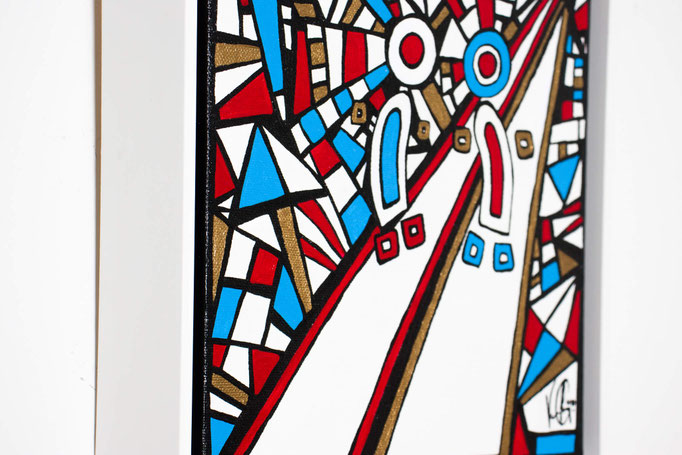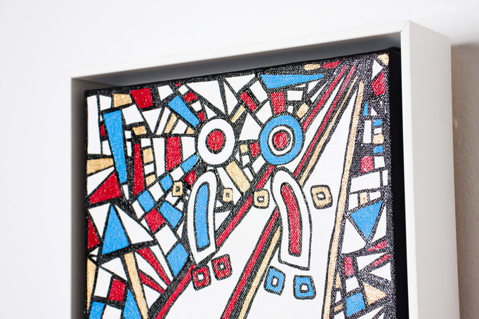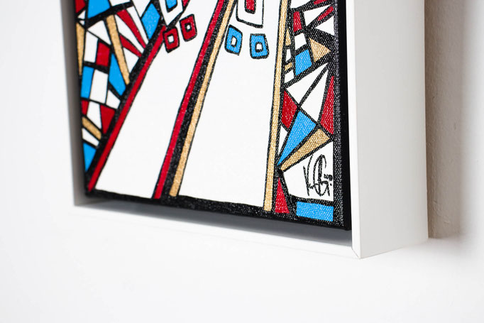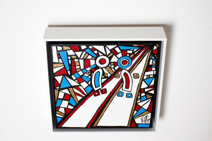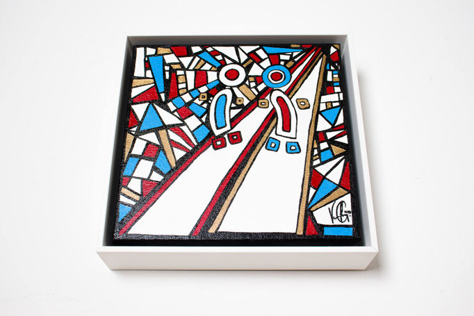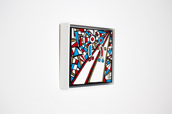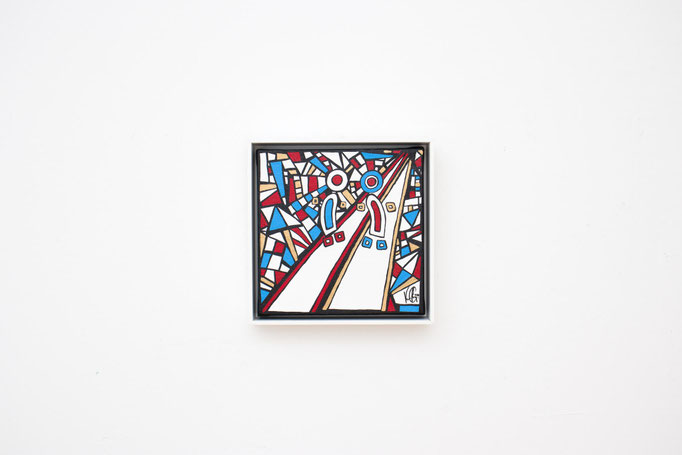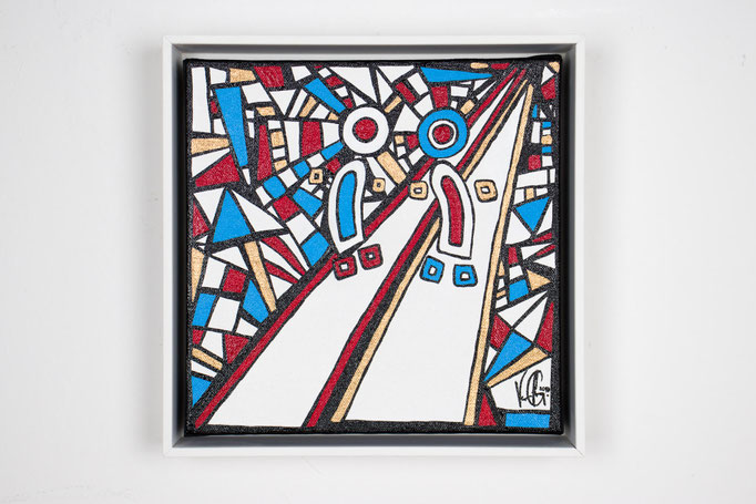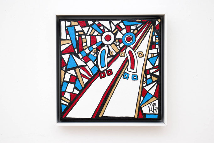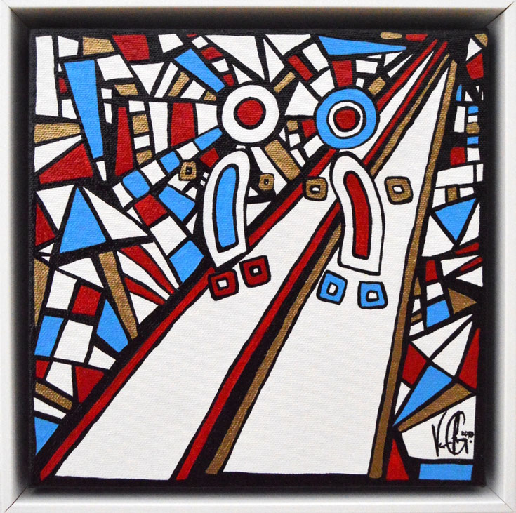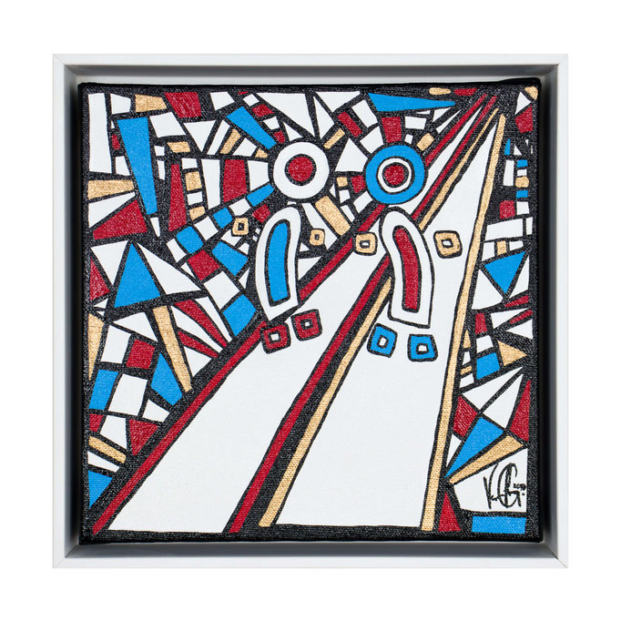 „Wege in eine Richtung“ zeigt zwei Figuren, die sich gemeinsam auf den Weg machen – nebeneinander, parallel, im gleichen Tempo. Die klare, helle Wegführung öffnet sich vor ihnen wie eine Einladung, während das farbintensive Umfeld in Blau, Rot und Gold die Dynamik des Moments unterstreicht. Die fragmentierte Umgebung wirkt wie ein Echo ihrer Schritte: lebendig, facettenreich, voller Eindrücke. Trotz all der Vielfalt um sie herum bleibt die Richtung deutlich. Die Figuren entscheiden sich nicht nur für denselben Pfad, sondern für ein gemeinsames Vorangehen – ohne Eile, aber mit Klarheit. „Wege in eine Richtung“ erzählt von Zusammenhalt und dem Mut, denselben Weg einzuschlagen, ohne zu wissen, wohin er führt. Ein Bild über Vertrauen, Gleichklang und die Kraft des Miteinanders.