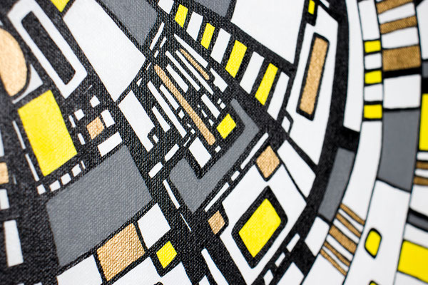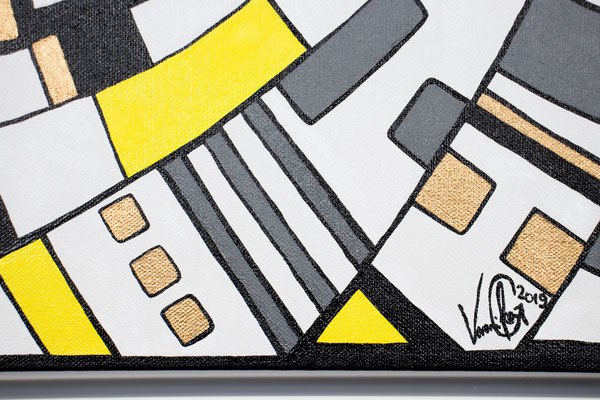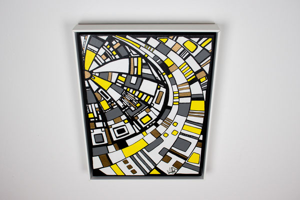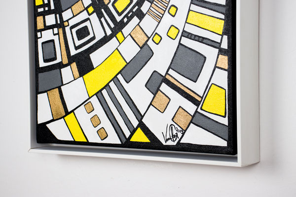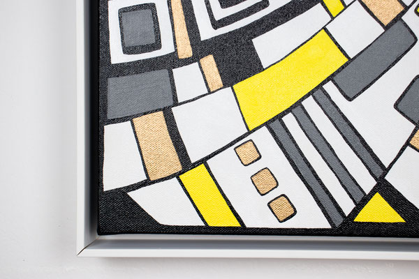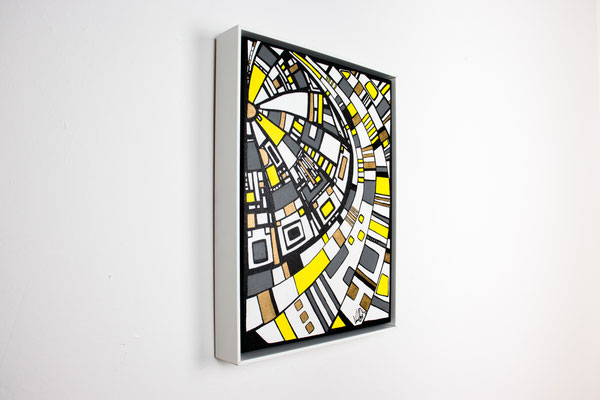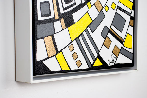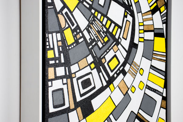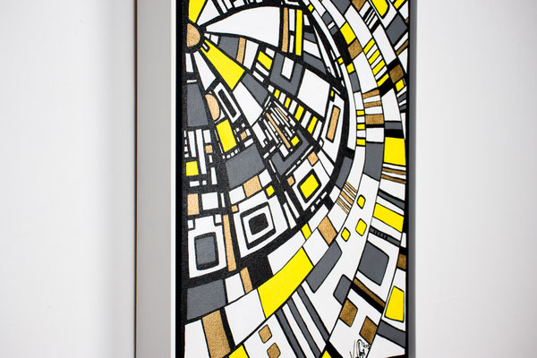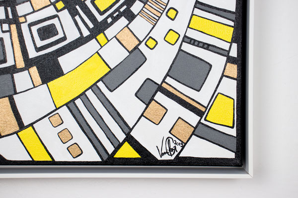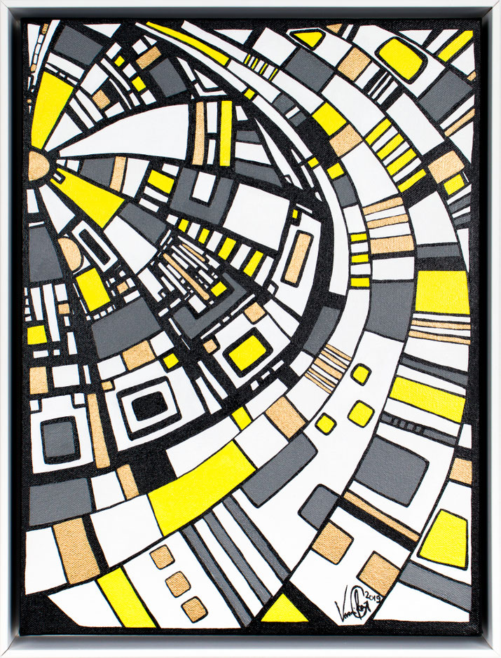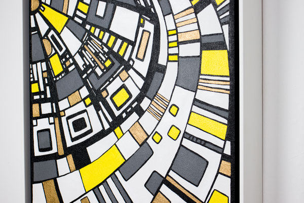 „Der Blick von oben“ eröffnet eine Perspektive, die gleichzeitig geordnet und dynamisch wirkt. Aus der Idee der spiralförmigen Architektur des Guggenheim Museums heraus entwickelt sich eine Komposition, die den Raum in Bewegung versetzt: Linien wölben sich, Wege kreuzen sich, Formen verdichten und öffnen sich wieder. Die typischen Fragmente in Weiß, Gelb, Grau und Gold greifen ineinander wie ein pulsierendes Netz urbaner Strukturen. In der Rundung entsteht eine sanfte Drehung – fast so, als würde man auf eine sich bewegende Stadtlandschaft oder auf ein kreisendes Gedankenmuster hinabsehen. „Der Blick von oben“ spielt mit Klarheit und Rhythmus. Das Werk lädt ein, Orientierung zu suchen, sich zu verlieren, wieder anzuknüpfen – wie ein Panorama, das sich beim Hinsehen immer weiter entfaltet. Acryl auf Leinwand, präsentiert im von der Künstlerin angefertigten weißen Rahmen.