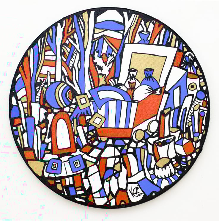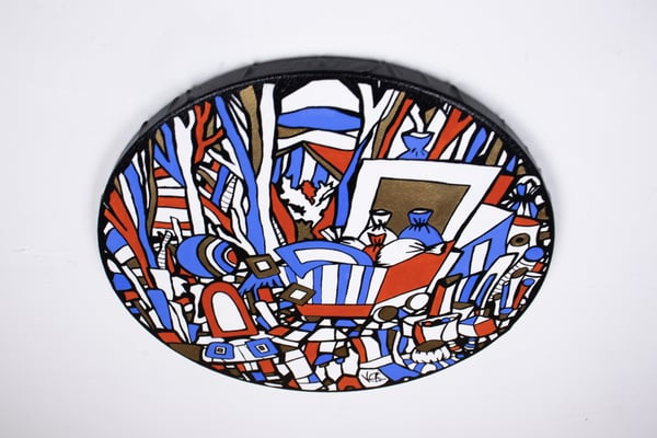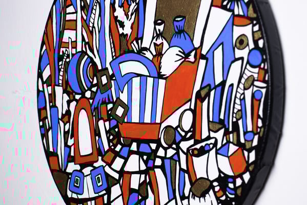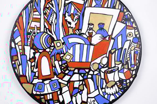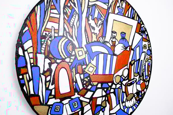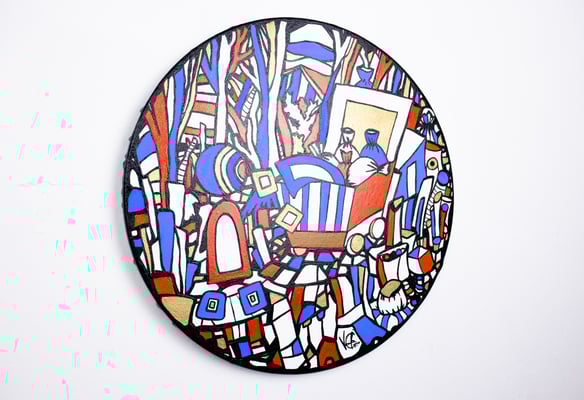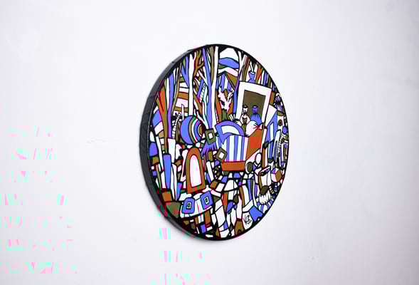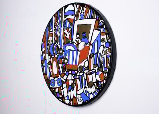 The circular work "Observing and Creating", painted in acrylic and lacquer, lets individual fragments form a story.